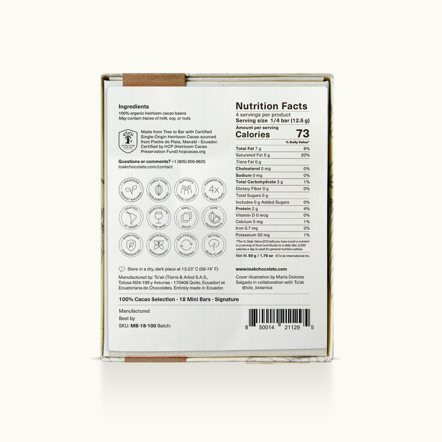 A seasonal selection of pure 100% chocolate bars from a specific harvest year (18 mini bars in total)