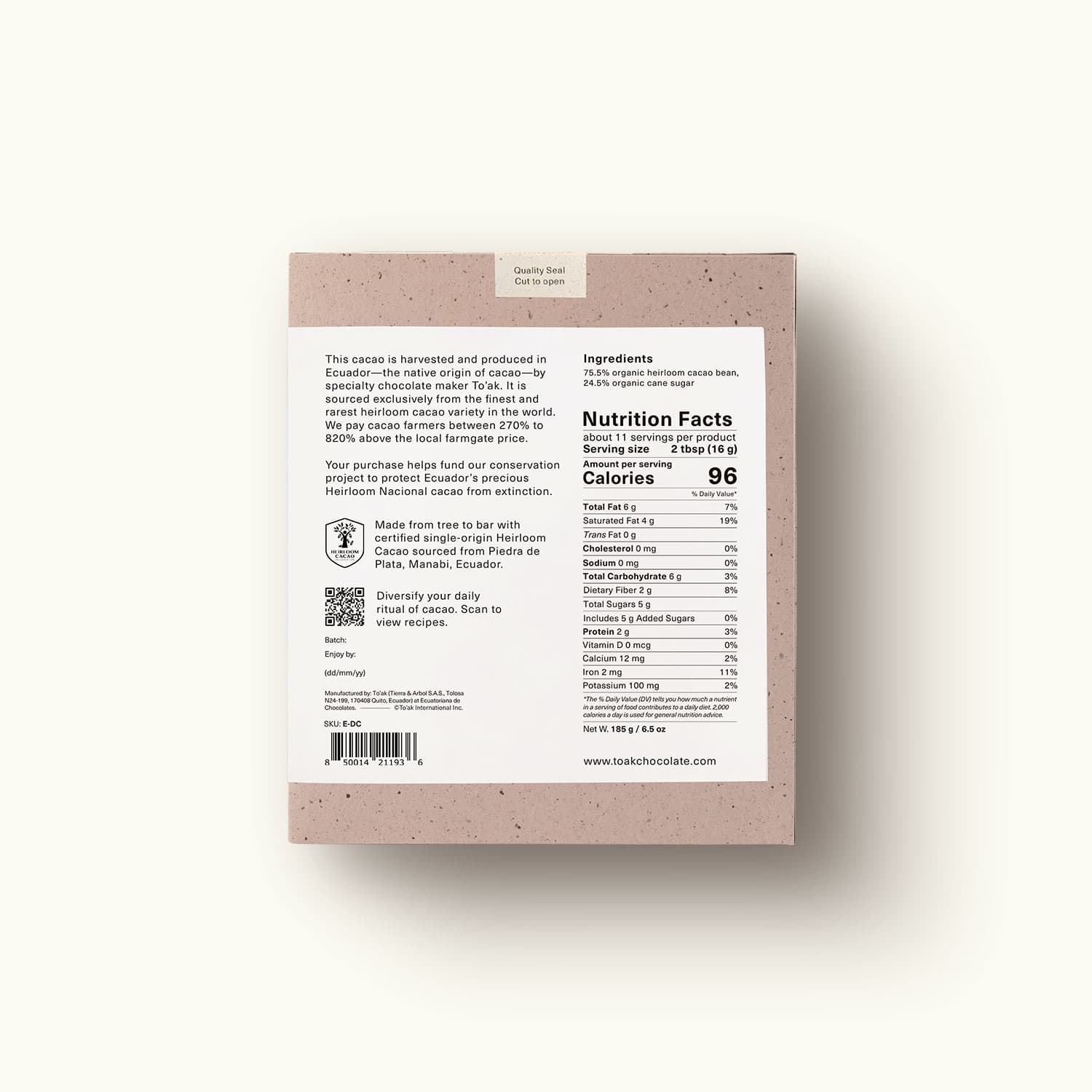 75.5% organic heirloom cacao bean, 24.5% organic cane sugar