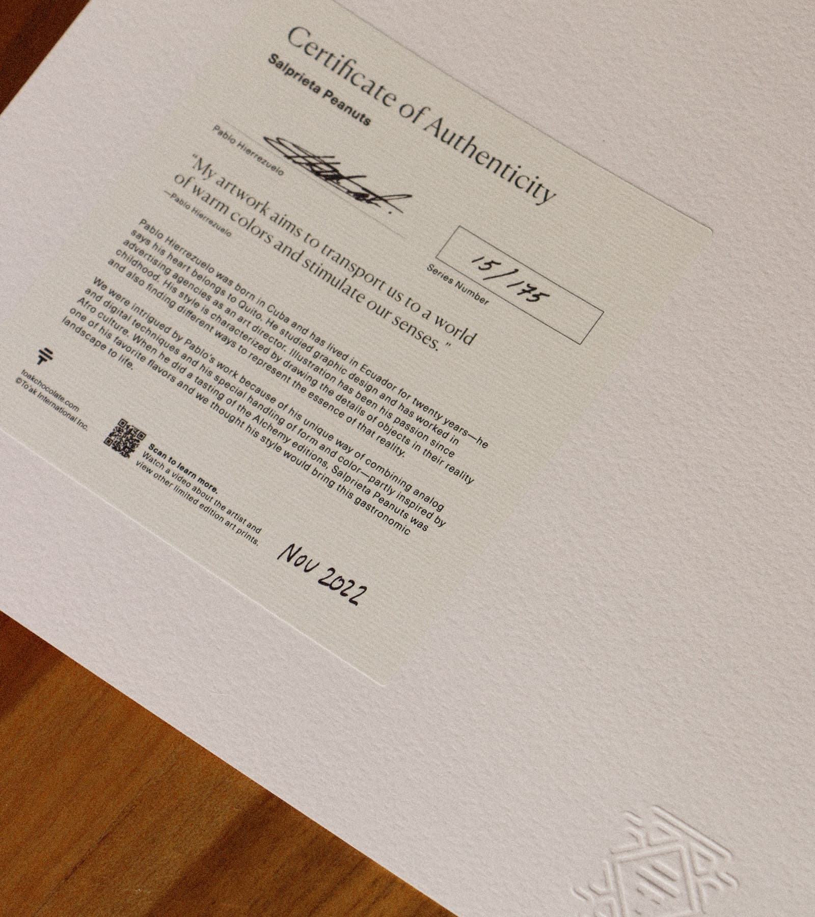 We then produced a limited series of 175 fine art prints per edition (45 cm x 47.5 cm / 17.7“ x 18.7“). Each fine art print includes an official certificate of authenticity signed by the author. The work is printed on 100% high-quality cotton paper. Our supplier guarantees this paper will last at least 100 years if kept under ideal conditions, including avoiding direct sunlight and high levels of humidity. Each art print also includes an embossed To'ak seal.