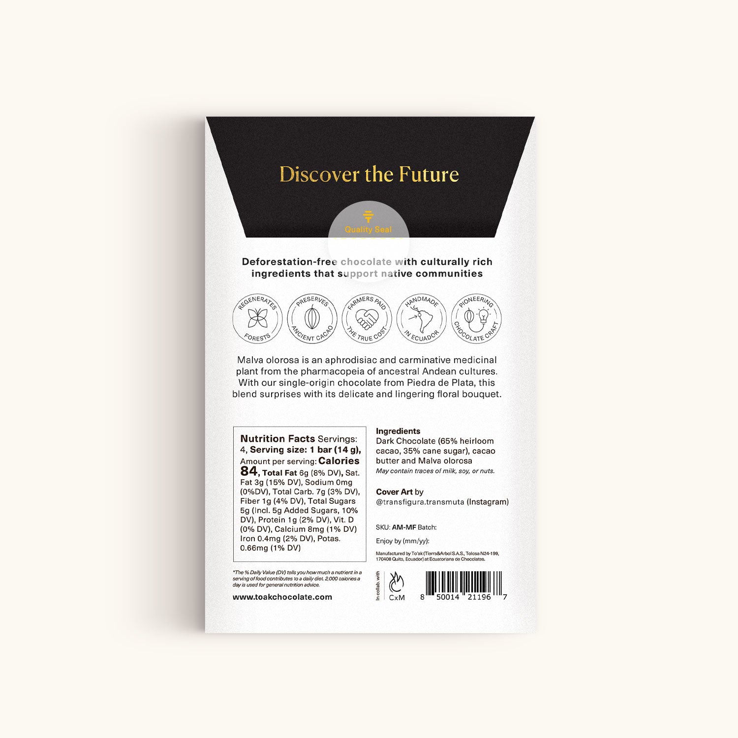 Dark chocolate (65% heirloom cacao, 35% cane sugar), Malva olorosa, cacao butter