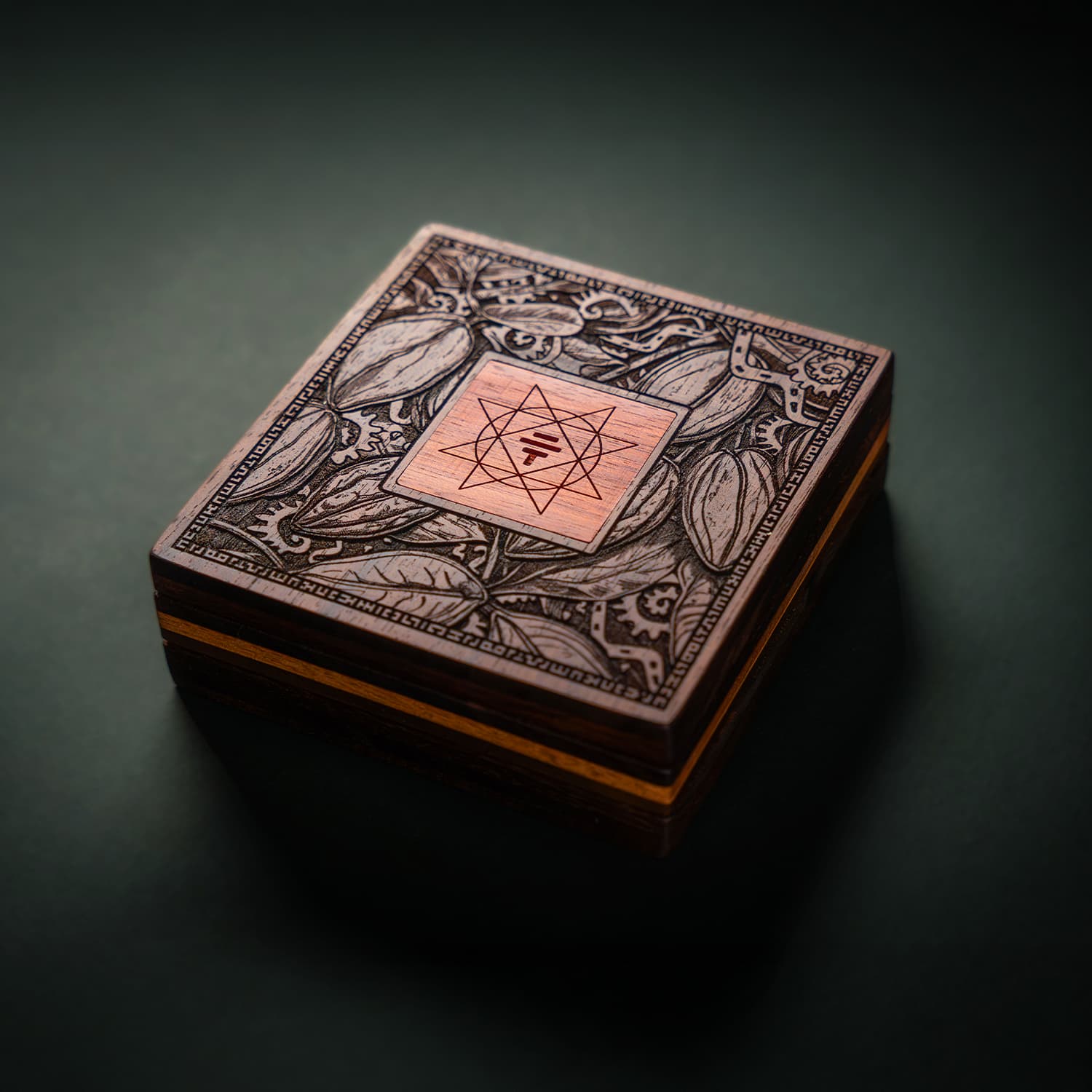 * Wooden box made of sustainably sourced Spanish Elm wood with an encapsulated cacao bean from the ancient heirloom trees at Piedra de Plata