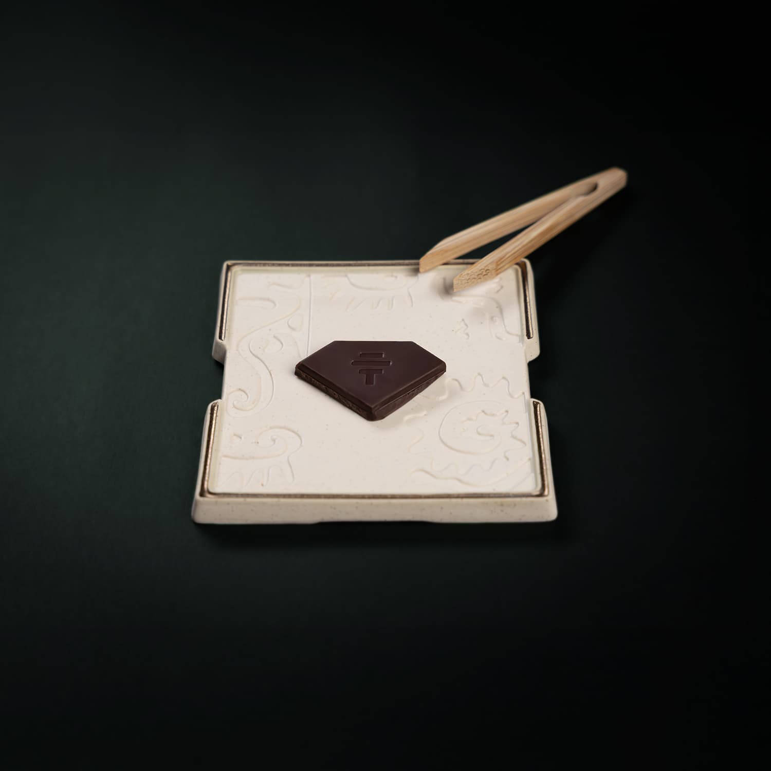 * 50 g (1.76 oz) duality blend chocolate bar, created exclusively for our most prestigious series, with a roasted cacao bean in the center