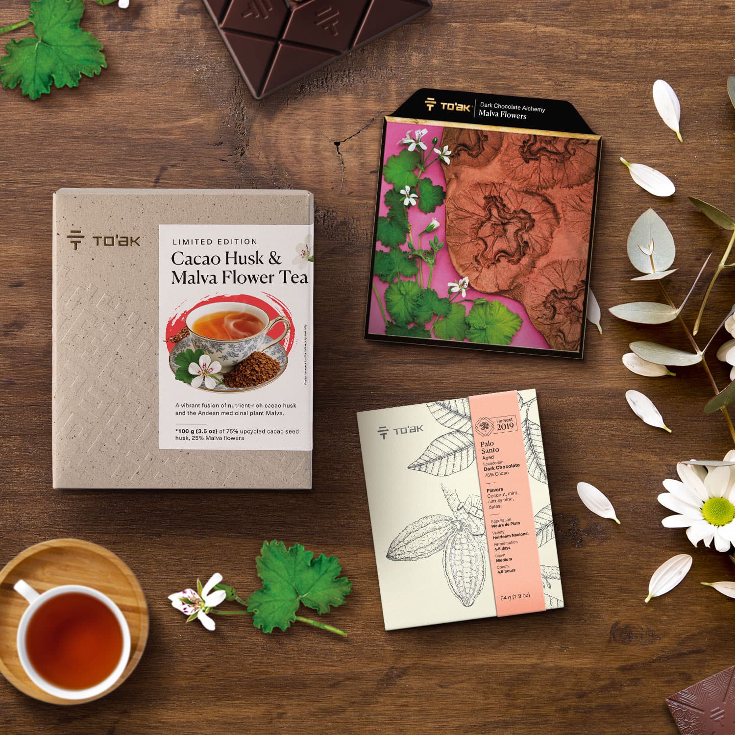 Cacao Husk & Malva Flower Tea (Non-GMO/organic cacao seed husks, Malva flowers); Palo Santo (75% Cacao beans, cane sugar); Alchemy Malva Flowers (Dark chocolate (65% heirloom cacao, 35% cane sugar), Malva olorosa, cacao butter)