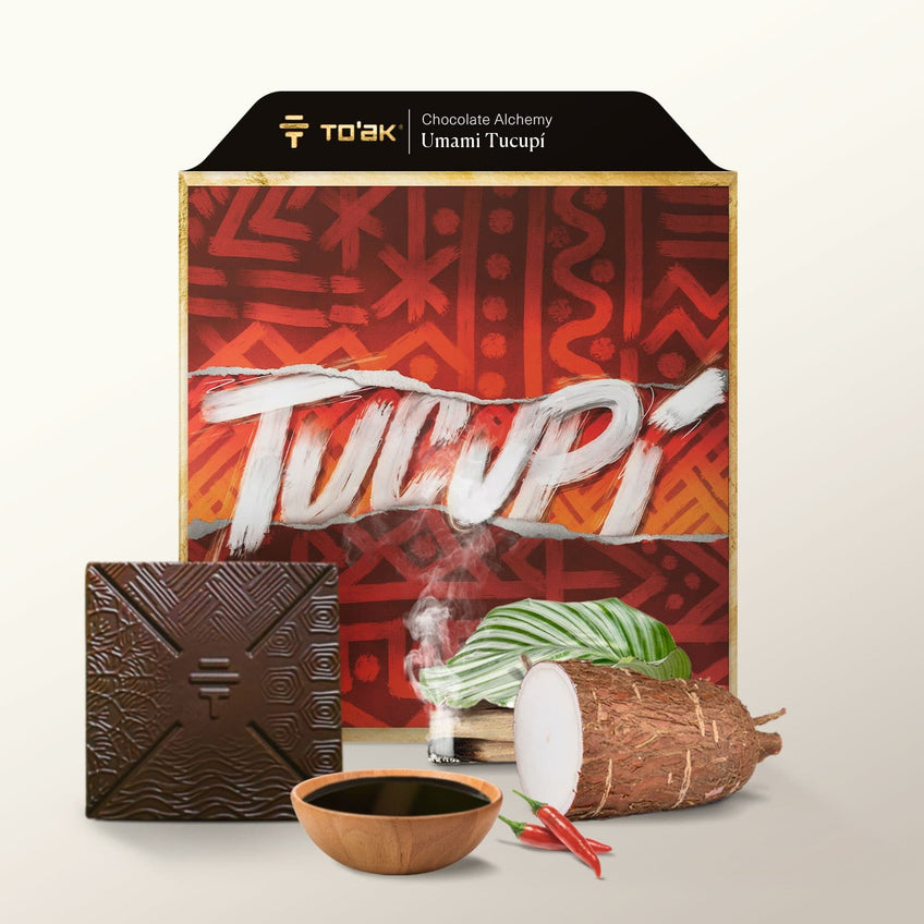 Dark chocolate (65% heirloom cacao, 35% cane sugar), tucupí (fermented and reduced yuca starch, chili pepper), cacao butter